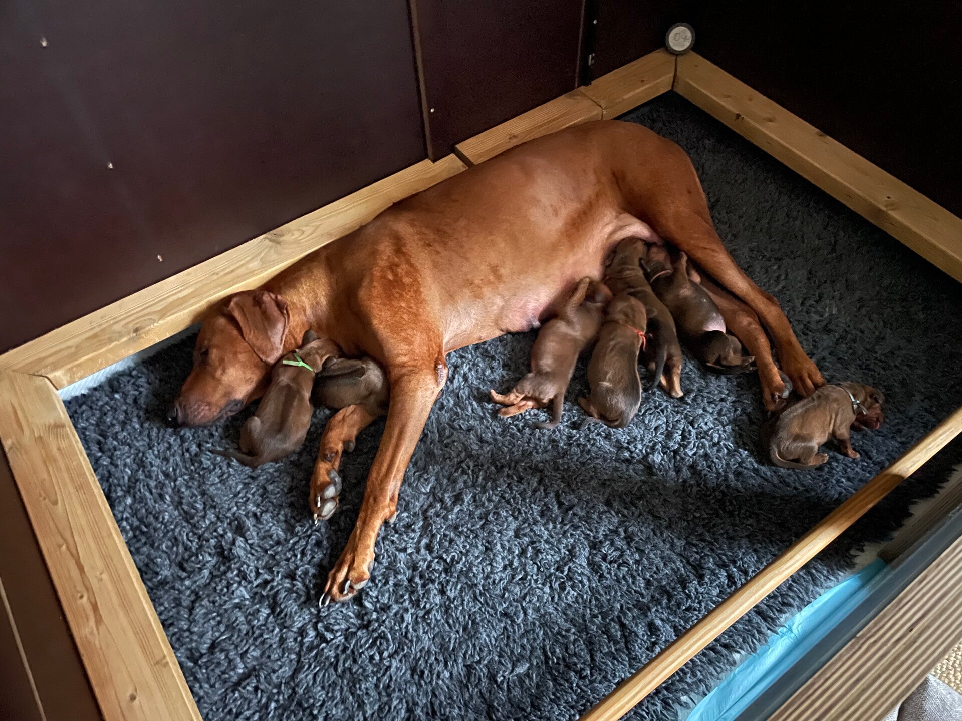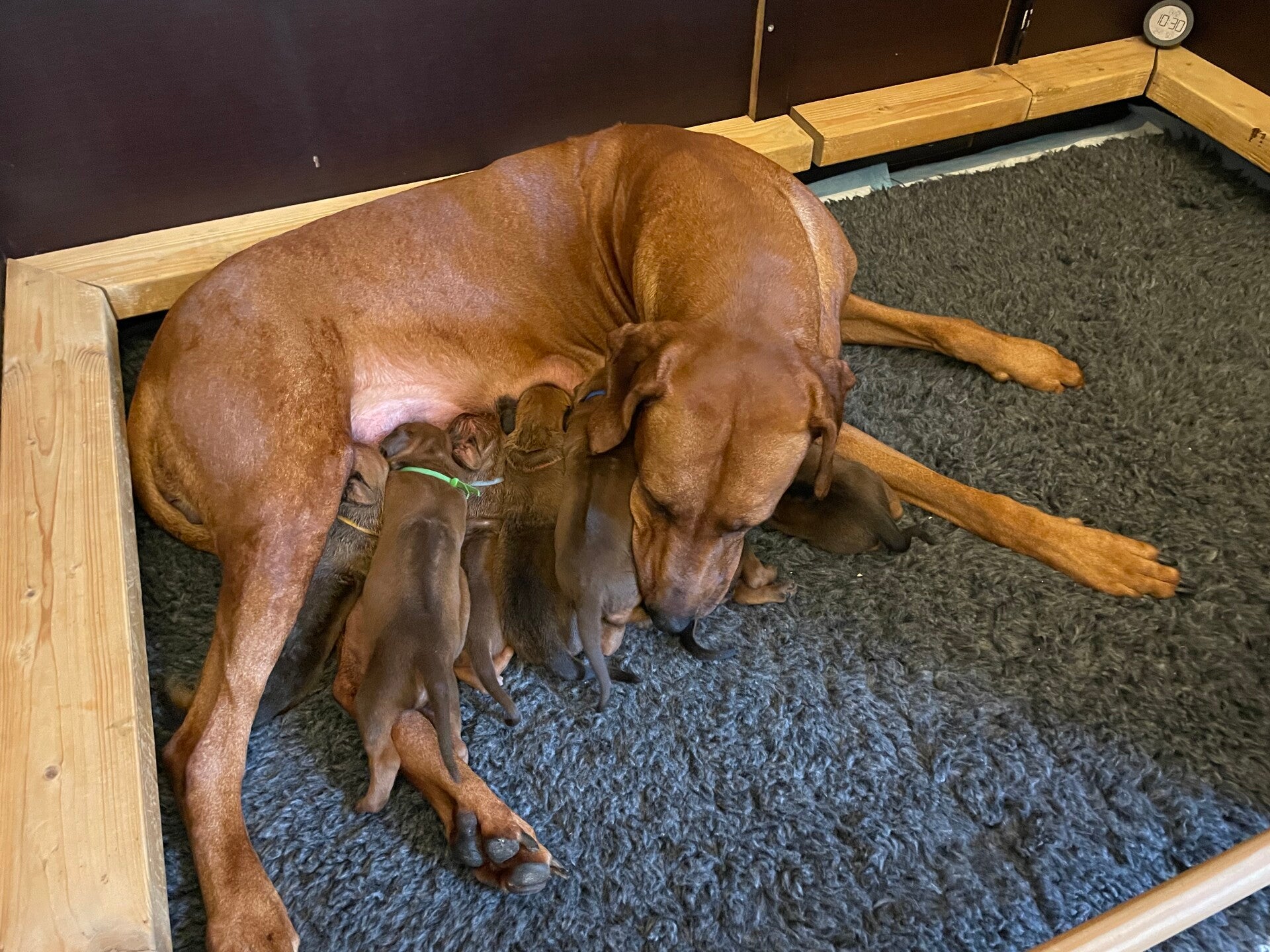 Deze eerste week is het vooral eten en slapen voor zowel moeder als pups.