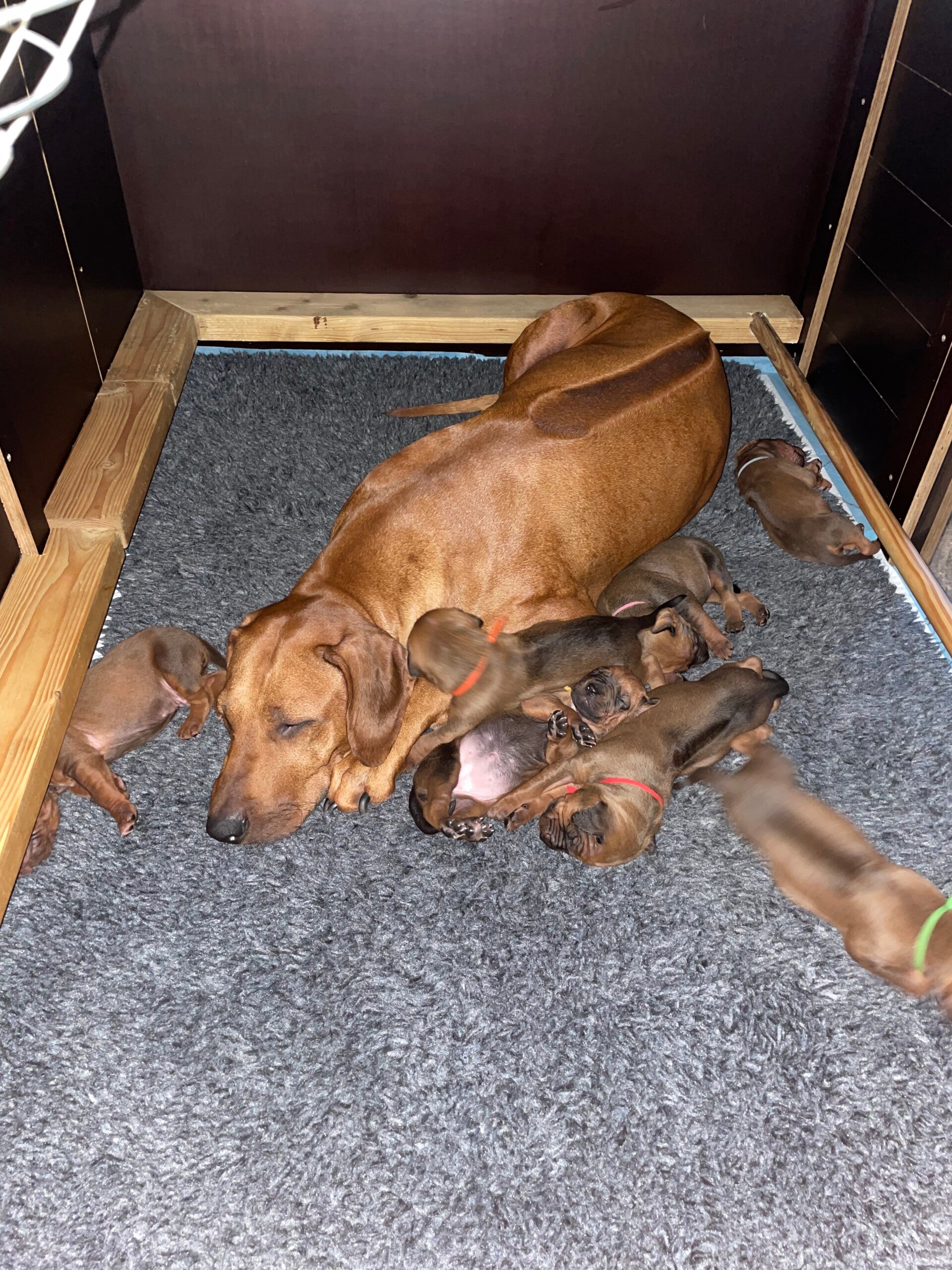 De kist hebben we inmiddels verhuisd naar de woonkamer dus de pups krijgen alles wat normaal is in een huishouden allemaal mee.